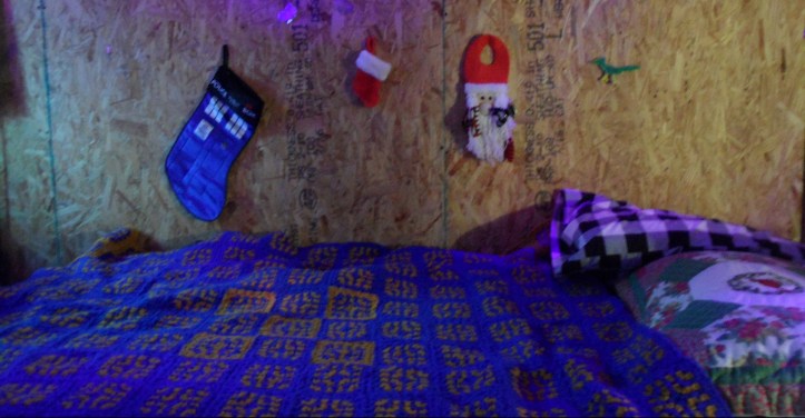 Even my bed is decorated with Winter pillows, and my Ravenclaw-colored blanket my mother had made for me a few Christmases ago keeps me nice and warm. (Yes, that’s a Tardus stocking. Yes, Santa has clips all over his beard, he thinks it’s fashionable.. And yes, I’m a huge nerd.)