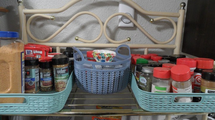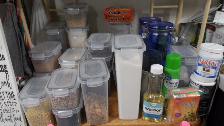 After fixing the spices on the top shelf, I took our boxes of noodles and other baking items and started putting them in my airtight storage containers for safe keeping. Thankfully, we don’t have any sugar ants here like we used to have down south, but I still like my food to be safely put away. Most of it was already in these containers, but we had just recently went shopping and picked up a few things, and I was too lazy to put them away.