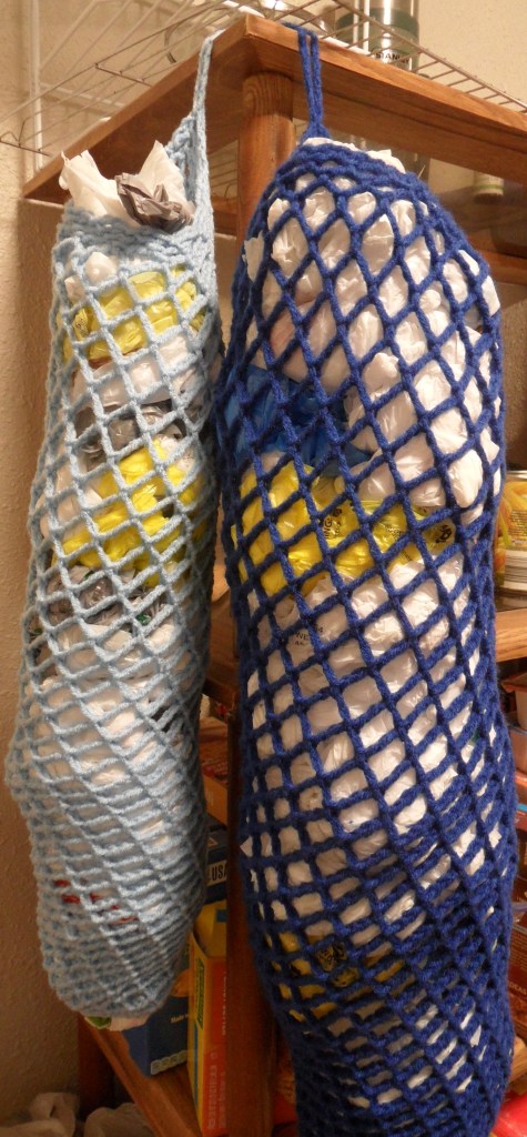 While we were out today, I also crocheted two bag holders for all of the plastic bags we had floating around. I have been meaning to do this for a while now, and I have just now gotten around to doing it.