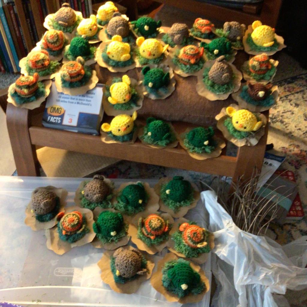 Besides the stuff we ordered… My grandmother’s house is getting invaded by little birds! These are a cute little wedding favor that a family friend of ours decided to make for me and it is the sweetest thing ever! After making all 50 of the birds, my grandmother put them on top of a coffee filter, some moss, and she is in the process of adding the twigs for the ‘nest’ in the picture below. These will be placed around the wedding venue for people to take home as a memento of the important day. It doesn’t look like much, but for anyone who knows me and my crocheting habits, this was perfect! 😍