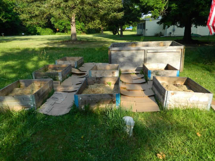 ANYWAYS! I had gotten boxes from work, which I had painstakingly sat and pulled all of the plastic off of this morning. I laid them around the garden beds and then went to my parents house to pick up the free woodchips they get delivered there.