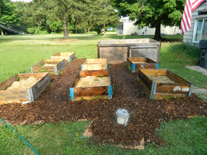 This morning, while it was still cool, I got to work on putting the woodchips down around the garden beds. Eventually we hope to get the whole front yard to look like this, as grass is a complete waste of time and space! We want to have a functioning yard for growing, not a yard that is going to kill us with heat stroke every summer as we continue to waste gas and time mowing every week for something that can’t be harvested.