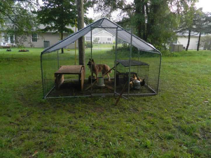 After we were sure the black dog was gone for the moment, we let the chickens out of the dog kennel and kept them close as we mended up the cage. I had run into town and grabbed some welded wire, which we put around the biggest holes, and then mended what I could with wire around the rest of the cage for a temporary fix. We cleaned all of the fur off everything, hosed down the kennel and water tank, and then put the chicken cage right up next to the house so that we could keep a close eye on them overnight.