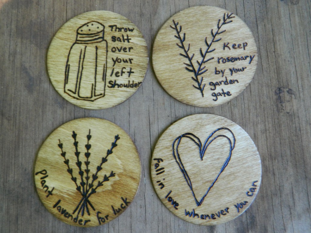 The summer craft fairs are now over, which leaves me plenty of time for making Christmas presents and crafts for the family. Below is a picture of some ‘Practical Magic’ inspired coasters I had made for my mother, and there is quite a bit of crafts leftover from the markets that is going to be used for Christmas presents!