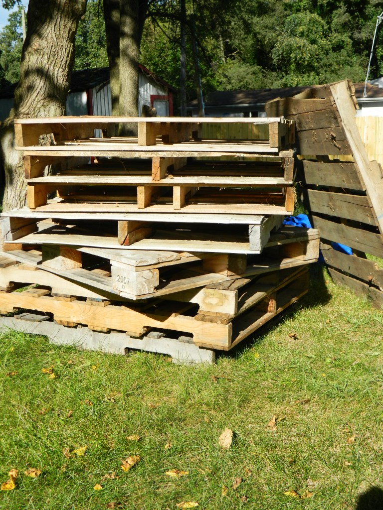 The neighbor just gave us a big stack of pallets, which we are going to use to make some more raised garden beds out front! With this stack of pallets, we will be adding at least two more garden beds to the front, making a total of ten garden beds for next year’s gardens! 🙂