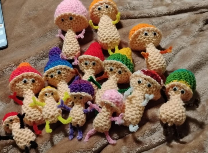 In addition to the coasters, I’ve been working on some crocheting crafts! I’ve been making some hair bandanas for the girls, I’m going to be working soon on some new hat and beards for the guys, and I made these adorable little mushroom people for the kids!